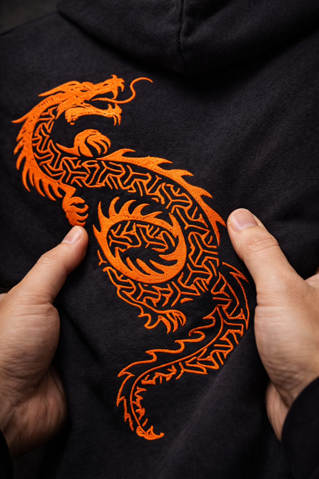 Dominating the back is a fiercely detailed embroidered dragon insignia, constructed with over 100,000 high-density stitches. The flowing dragon form symbolises strength, resilience, and controlled energy, brought to life through layered threadwork that adds depth, texture, and long-lasting durability. Every stitch is engineered for clarity and definition, ensuring the embroidery retains its impact wear after wear.