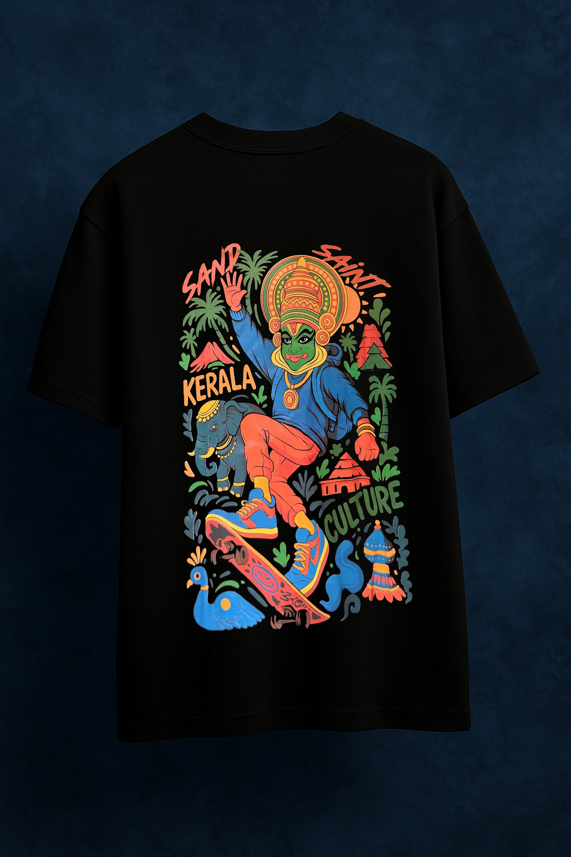 - Back Print: A Kathakali dancer on a skateboard — energetic, surreal, and deeply rooted in Kerala’s cultural aesthetic